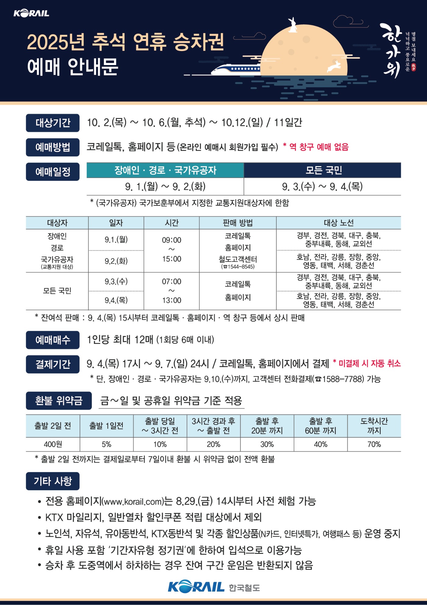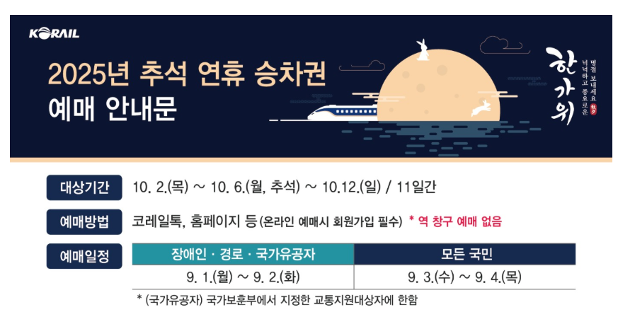 코레일(KORAIL)에서 발표한 2025년 추석 연휴 승차권 예매 일정이 공개되었는데요,